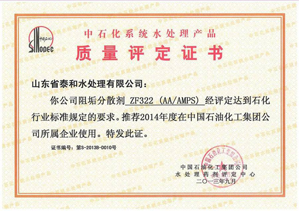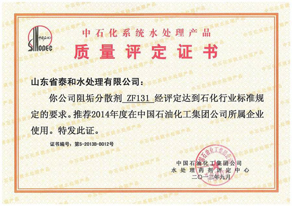 | 中石化系統(tǒng)水處理產(chǎn)品質(zhì)量評(píng)定證書