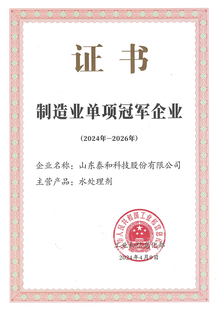 近日,泰和科技領(lǐng)到了國家工業(yè)和信息化部頒發(fā)的“制造業(yè)單項冠軍企業(yè)”證書,代表公司順利通過了復(fù)核。該稱號的延續(xù)不僅體現(xiàn)了泰和科技在水處理劑制造領(lǐng)域的卓越實力,也充分展示了公司在市場份額、創(chuàng)新能力、質(zhì)量水平、品牌影響力等方面的顯著優(yōu)勢。